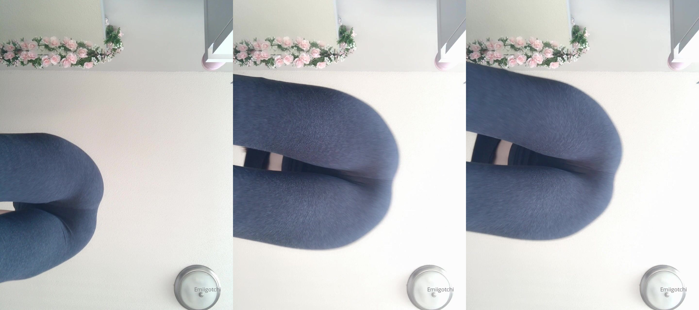 Emi squats in yoga suit over camera